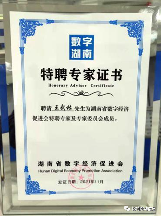 热烈祝贺王武林先生被聘请为湖南省数字经济促进会特聘专家及专家委员会成员